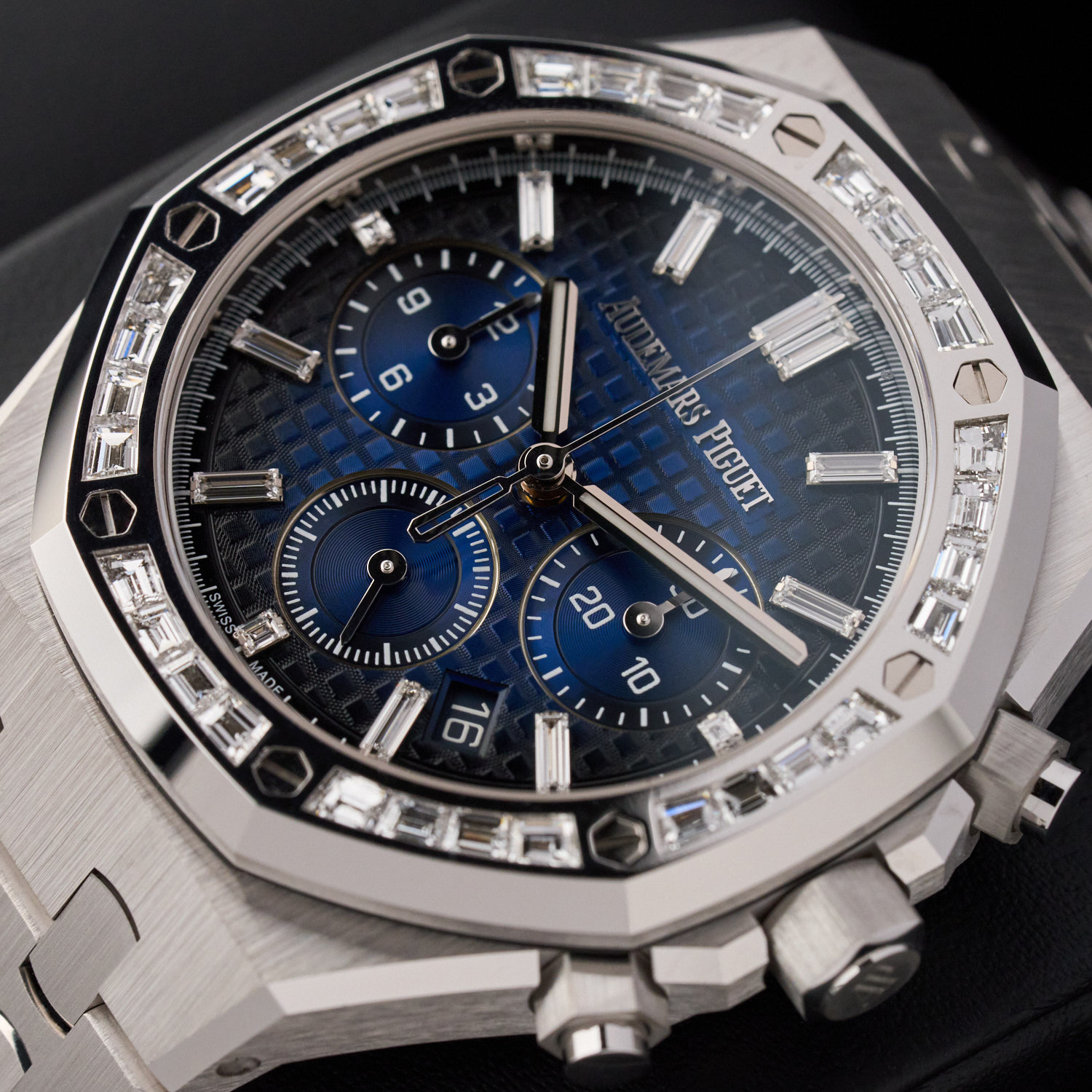Audemars Piguet Royal Oak Chronograph 26715BC – Smoked Blue Dial – Baguette Factory Bezel – Full Set – New