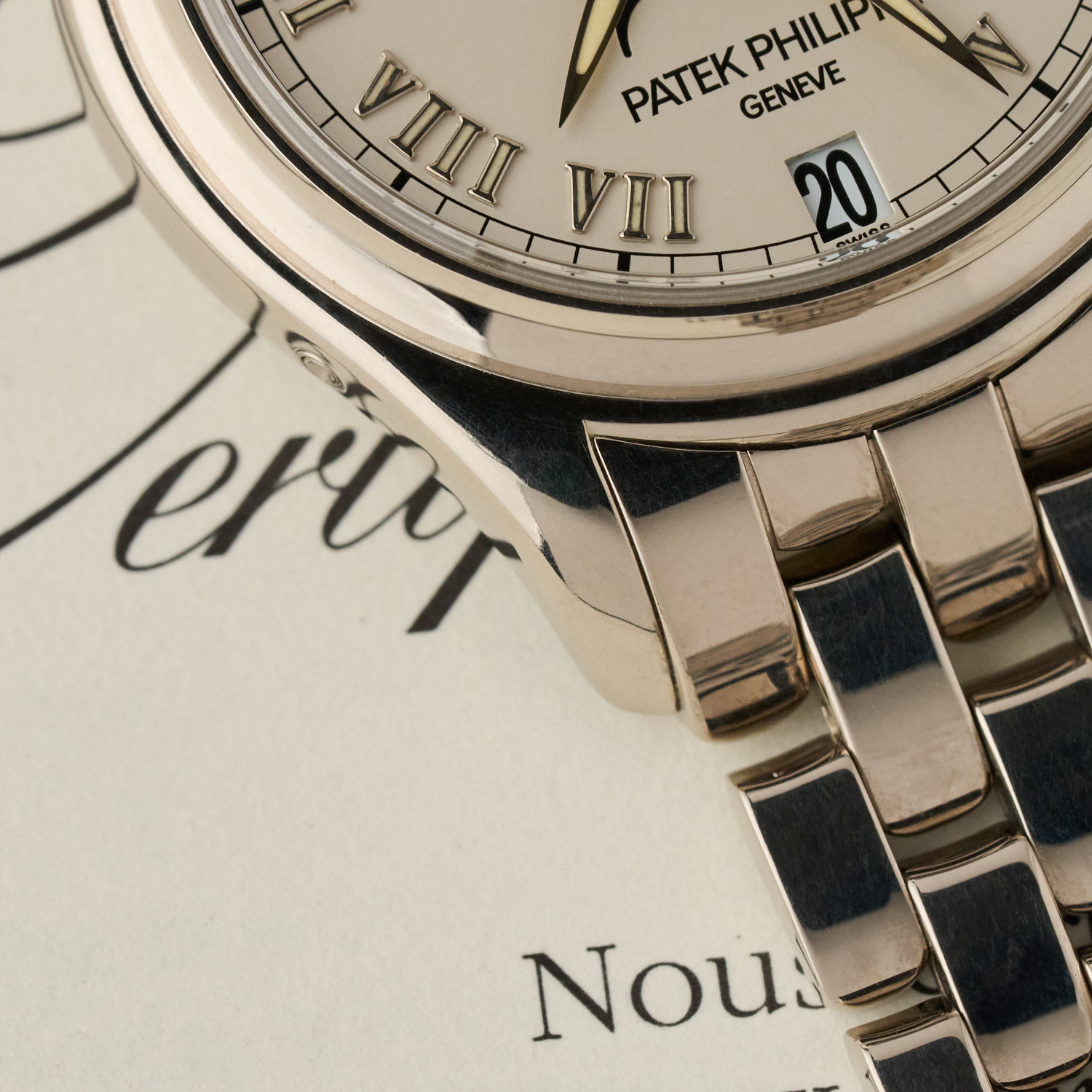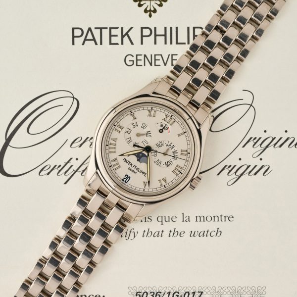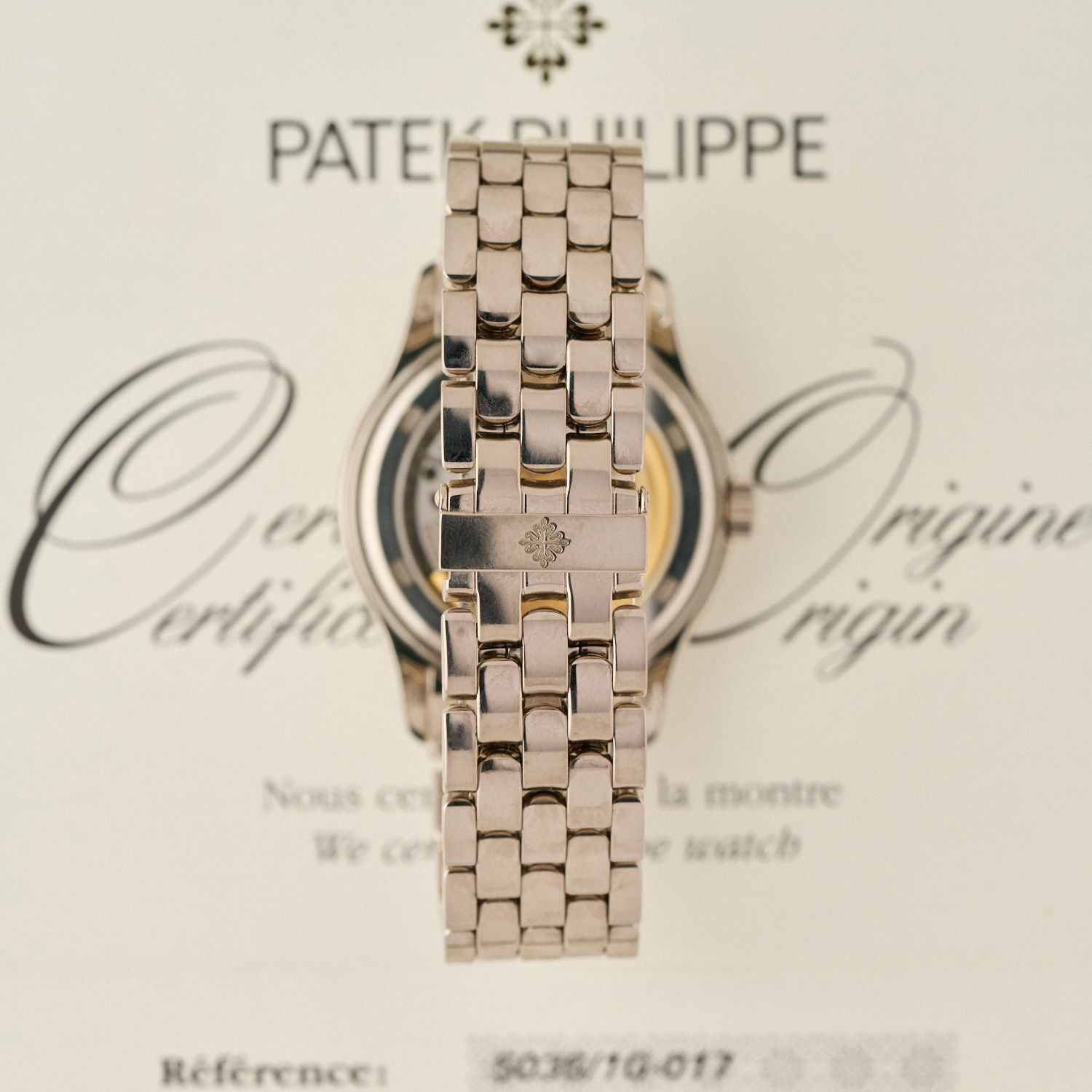 The current Patek Philippe reference 5036G with annual calendar complication has the following characteristics: