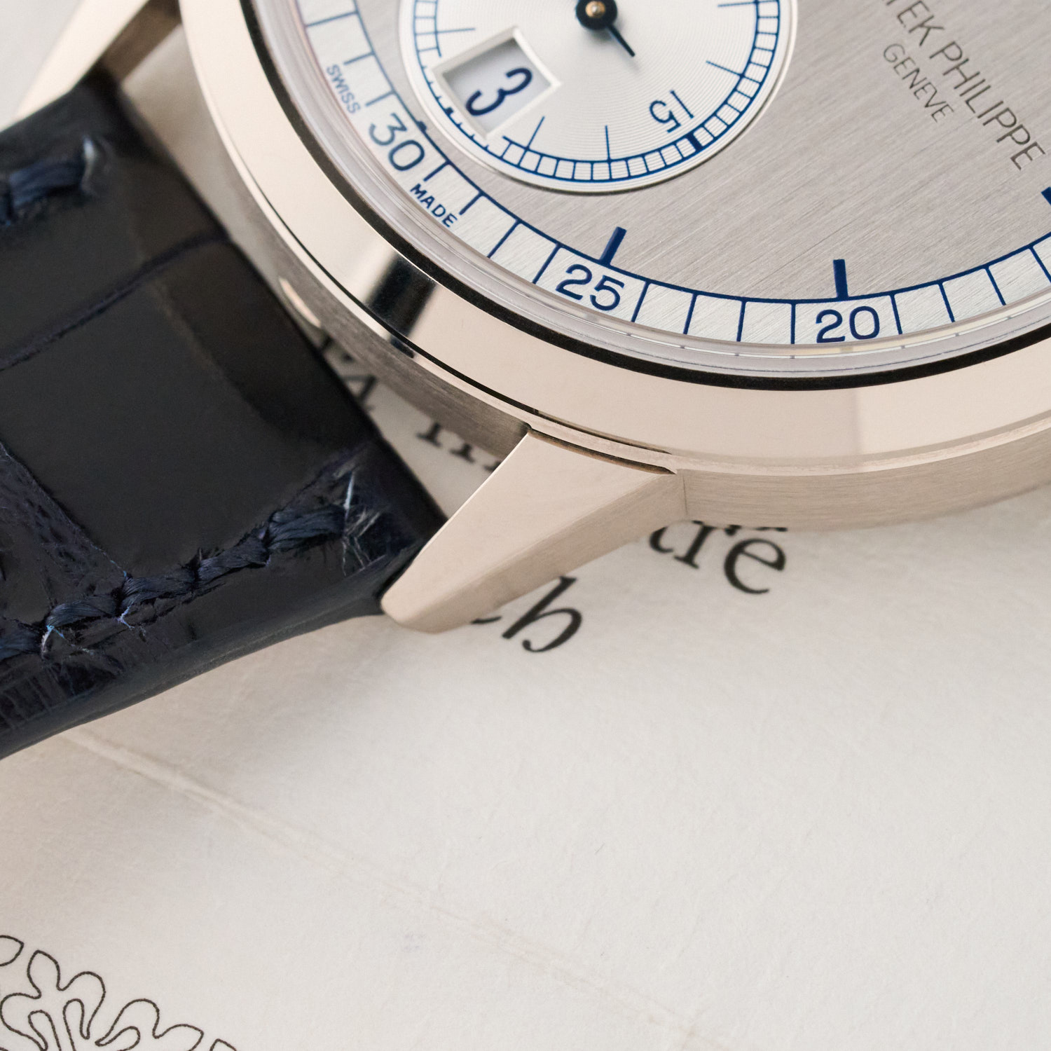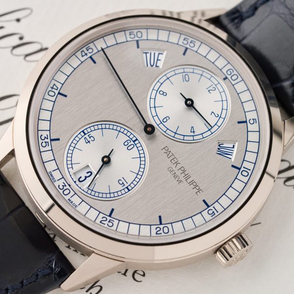 The Patek Philippe reference 5235G, featuring an off-center dial displaying the hours, minutes, and seconds, was introduced in 2011, introducing the new complication of a time regulator. Powered by the caliber 31‑260 REG QA, a self-winding manufacture movement with an annual calendar, it combines chronometric precision with technical innovation. The elegant vertical satin finish of the dial and the design inspired by observation watches lend the model a distinctive aesthetic. A perfect synthesis of watchmaking tradition and modernity, it represents an expression of excellence from the Genevan maison.
