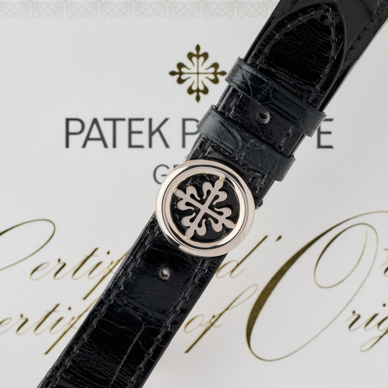 | Strap/Bracelet Material | Black Alligator strap with 18k White Gold PP Deployment Clasp |
