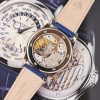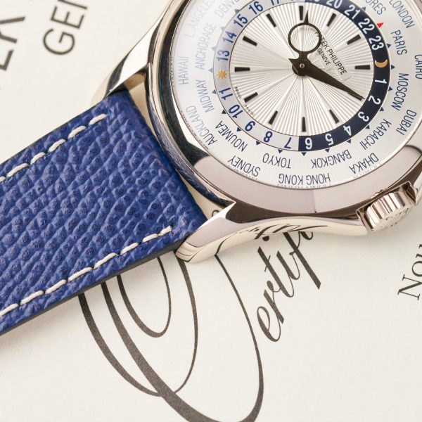 Introduced in 2000, the Patek Philippe ref. 5110 was the first mass-produced world time reference, and also the first after the legendary ref. 2523. It has brought a visible evolution compared to the ref. 2523 using a pusher at 10 o'clock to set the local city in place of the famous second crown. It also made the switch from a hand-wound movement to an automatic one. The reference 5130 was presented in 2006, replacing the iconic reference 5110. This new reference was initially presented in white gold and rose gold. The platinum version of the reference 5130 was presented in 2007.