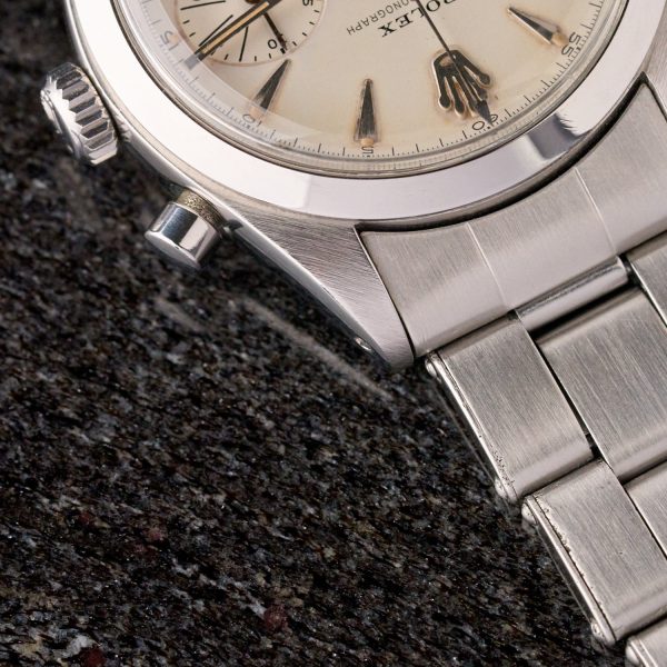 Reference 6238 is the bridge between traditional Rolex chronographs and later modern Rolex chronographs. Introduced in the early 1960s, preceding the first Daytona by a few years, it was produced until 1967 when it completely gave way in the catalogue to the various versions of the Daytona: for this very reason the reference is known in the world of collectors with the nickname “Pre-Daytona” to underline its role as predecessor of the famous model. The 6238 is the last chronograph produced by Rolex to have a smooth bezel and a graduated scale printed on the dial, speaking of the clock face, Reference 6238 will also be the last to feature monochromatic dials (Rolex experimented with contrasting counters with this reference, with the very rare “Panda” version).