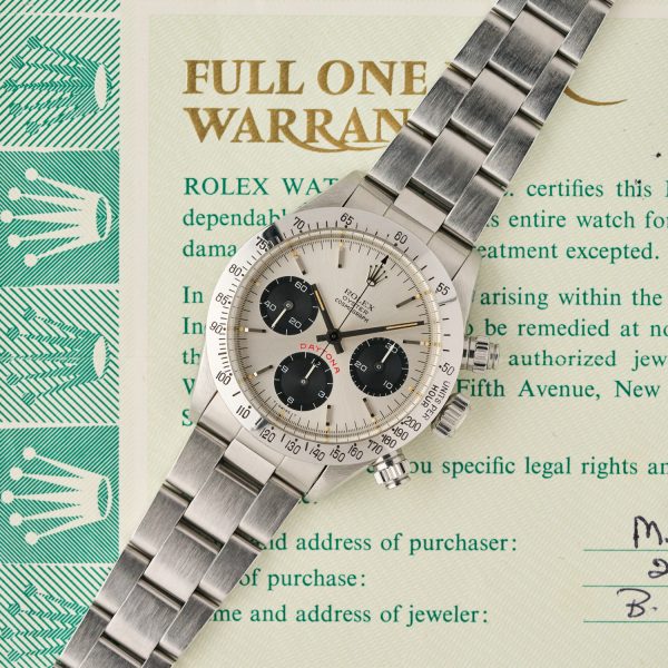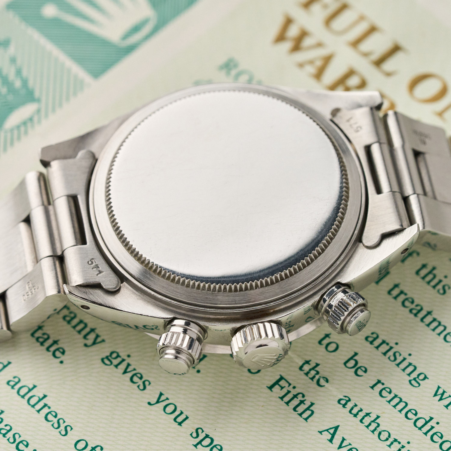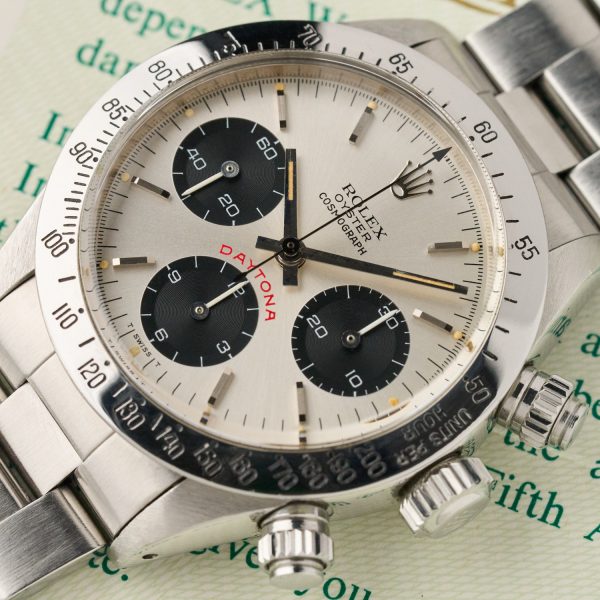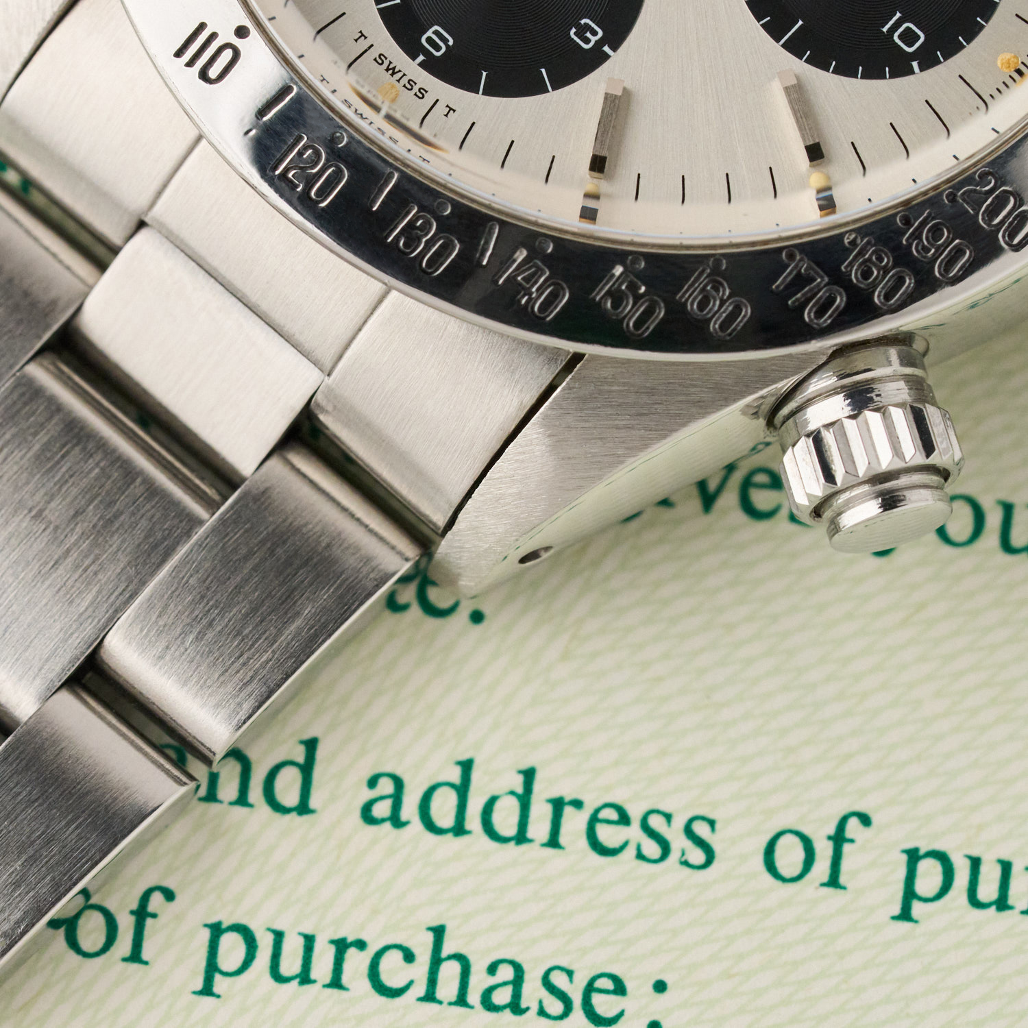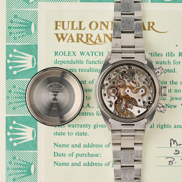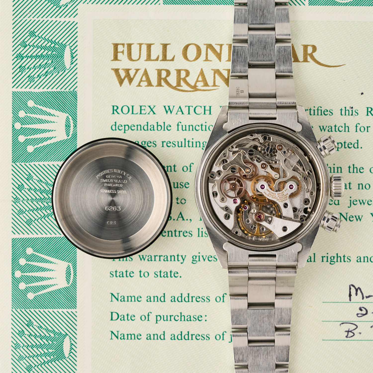 The bezel of the Rolex 6265 was made of metal with an engraved tachymeter scale, unlike that of the Rolex 6263, which was printed in white on a black bakelite background.