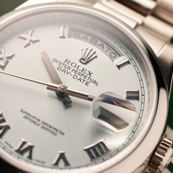 ROLEX DAY-DATE 118206 PLATINUM BLUE ICE DIAL WITH ROMAN NUMERALS – NOS – FULL SET ITA