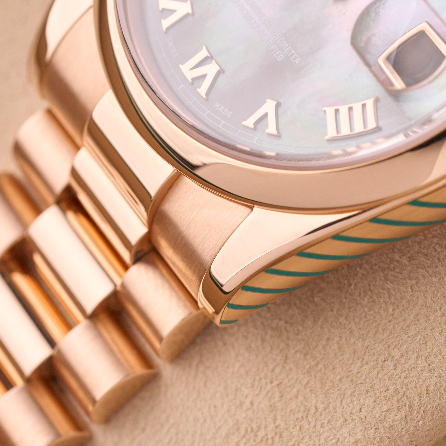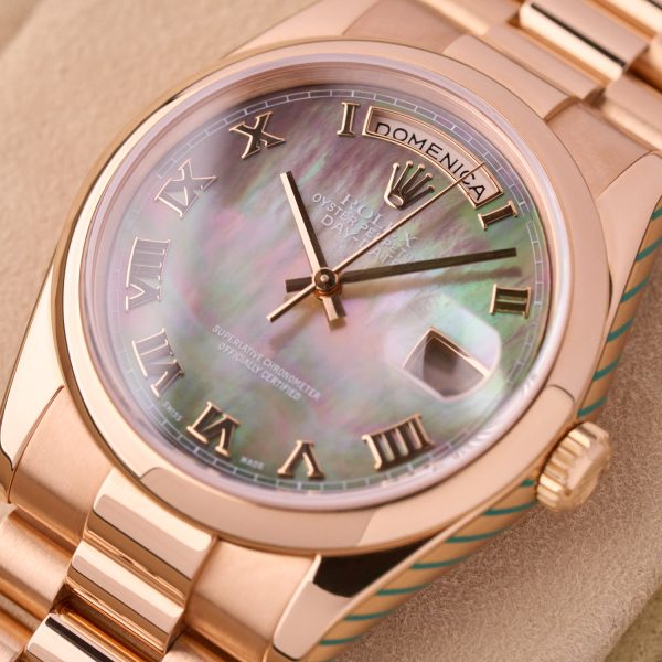 This rare example of Rolex Day-Date reference 118205 boasts the following features: