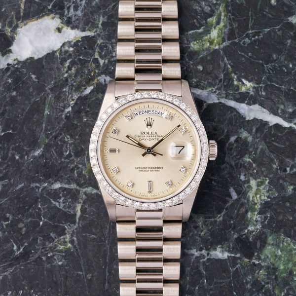 Rolex Day-Date 36 Silver Dial – 18K White Gold – Factory Diamonds Set – Excellent Conditions