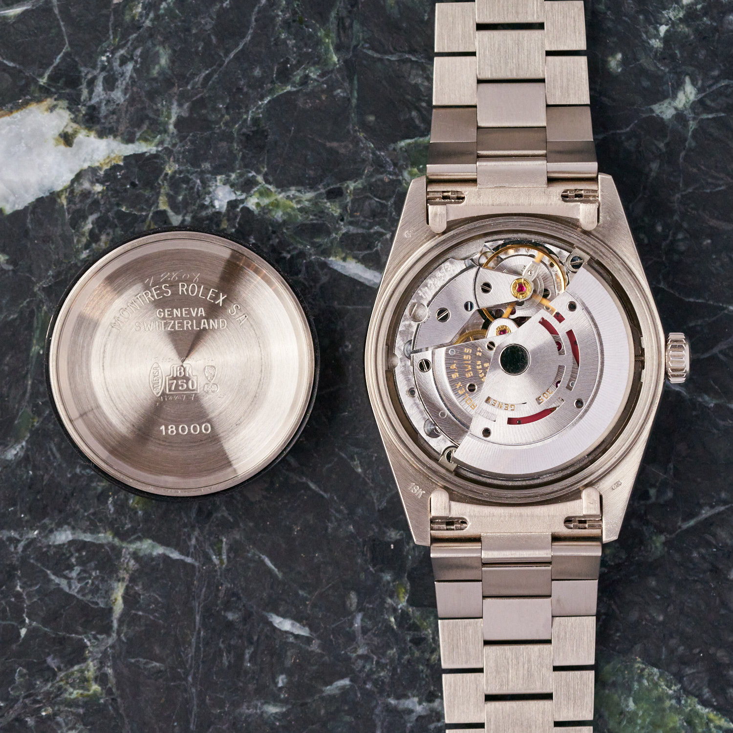 This model Rolex Day-Date reference 18049 boasts the following features: