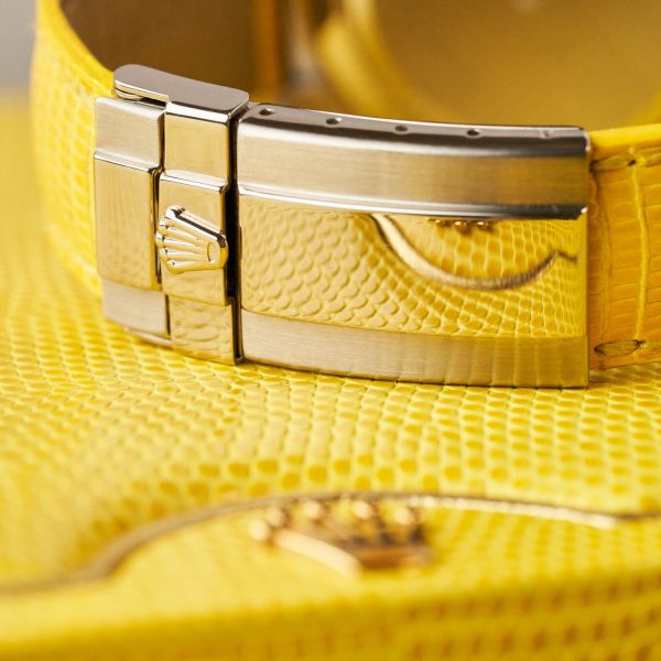 STRAP/BRACELET MATERIAL: Yellow Lizard Strap with 18K White Gold Adjustable Buckle