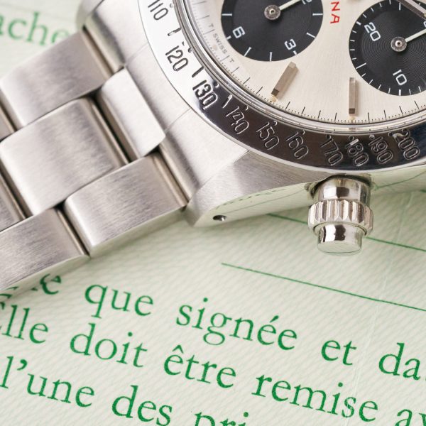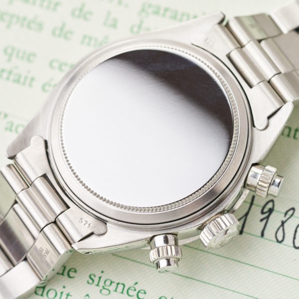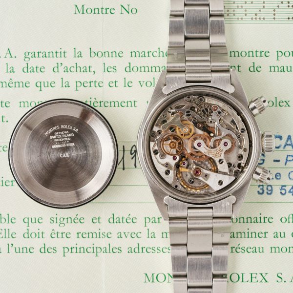 The bezel of the Rolex 6265 was made of metal with an engraved tachymeter scale, unlike that of the Rolex 6263, which was printed in white on a black bakelite background.