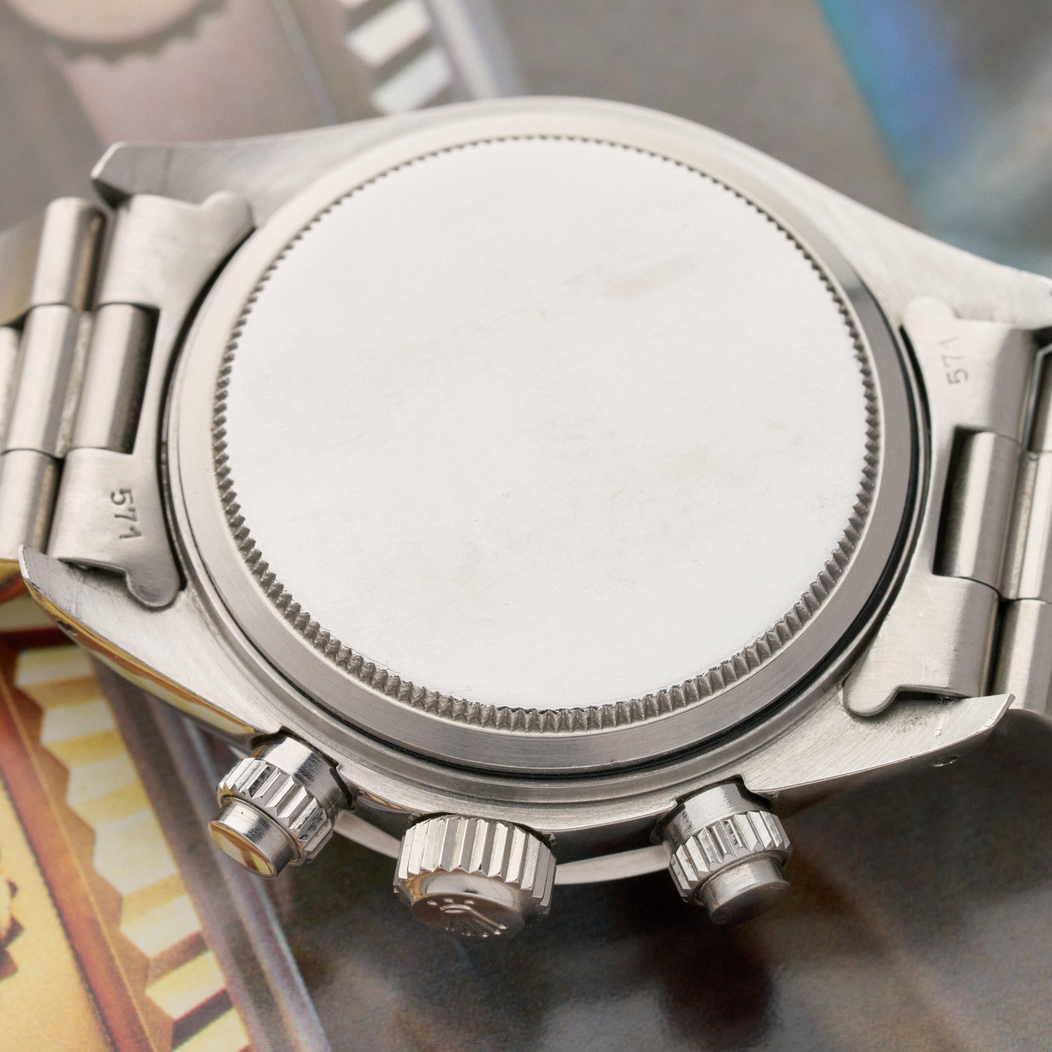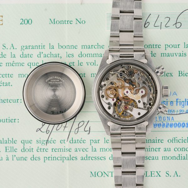 The bezel of the Rolex 6265 was made of metal with an engraved tachymeter scale, unlike that of the Rolex 6263, which was printed in white on a black bakelite background.