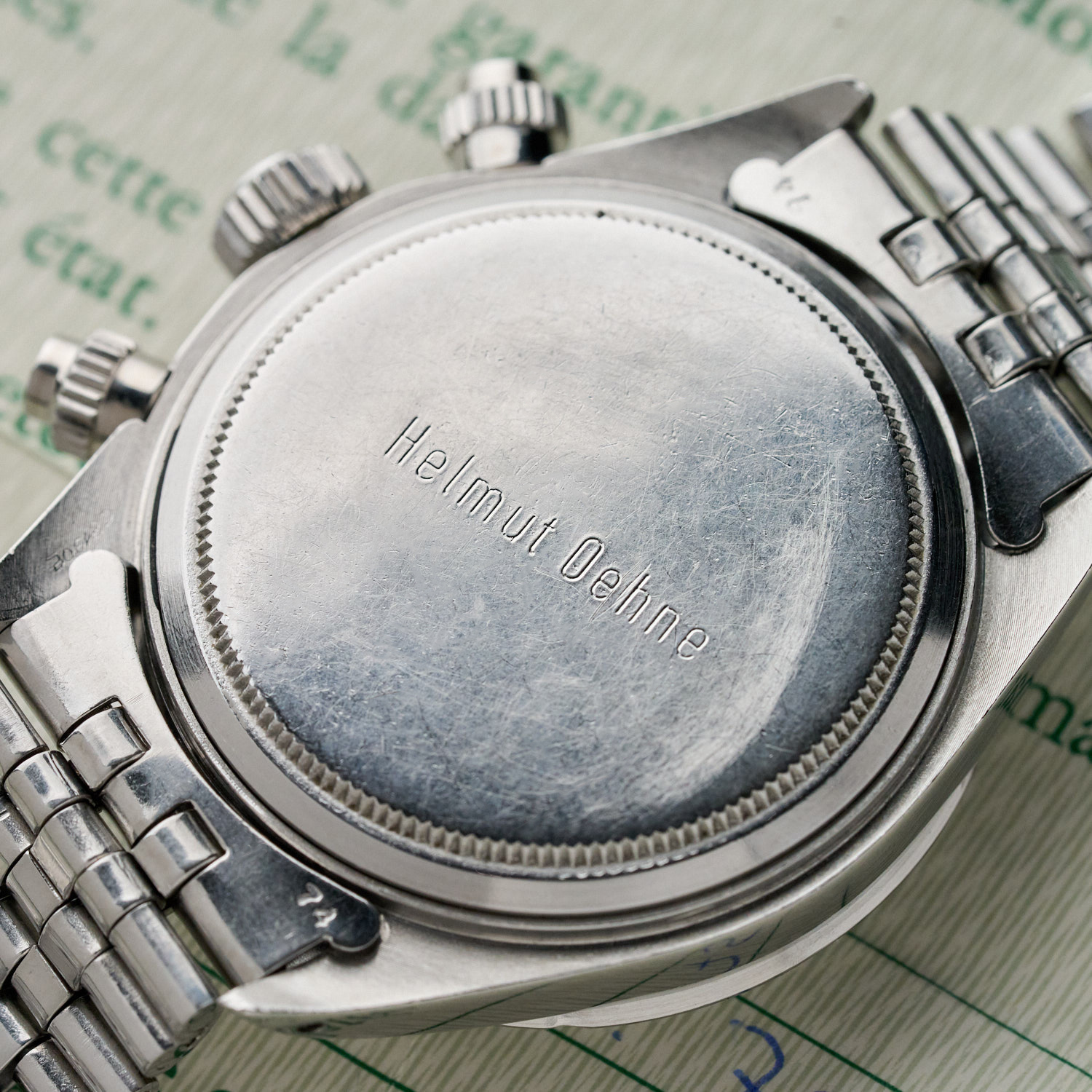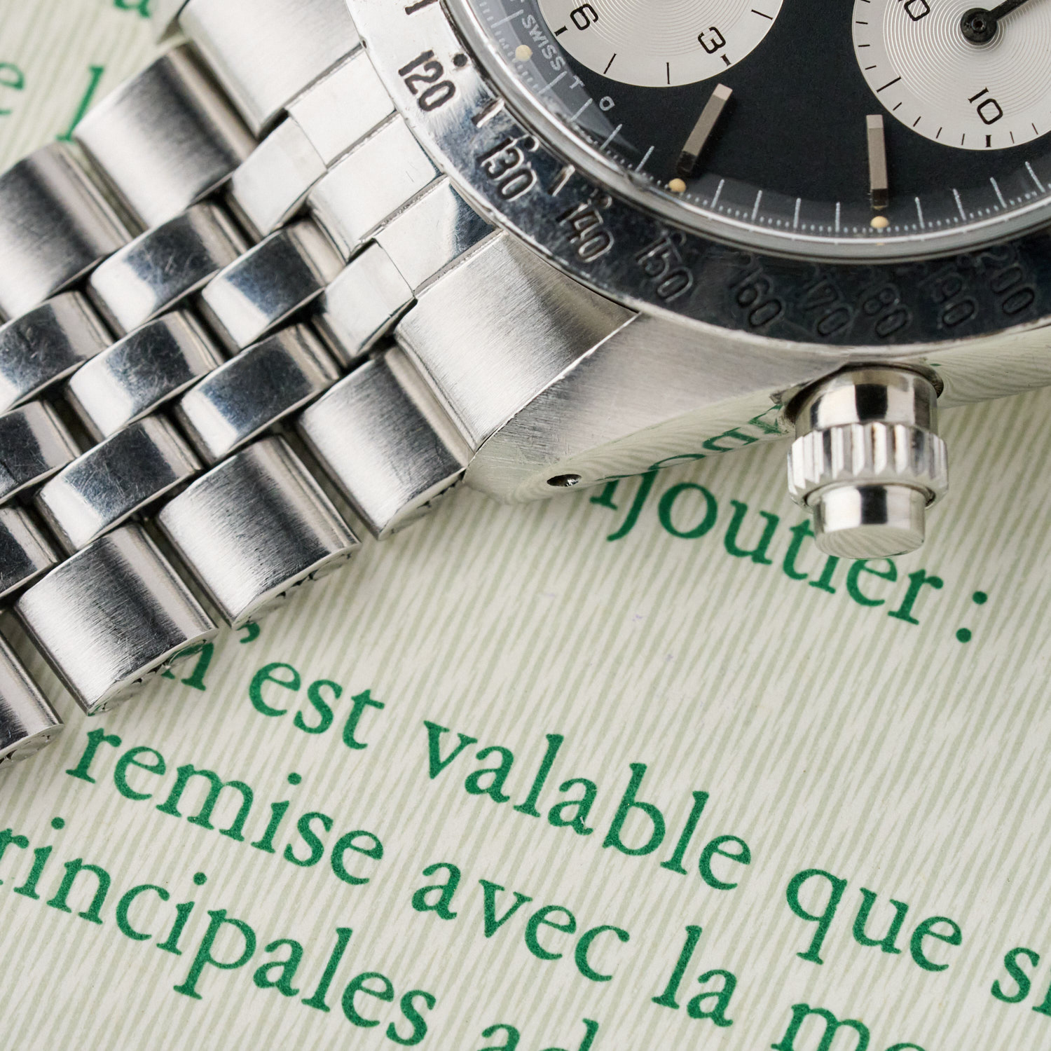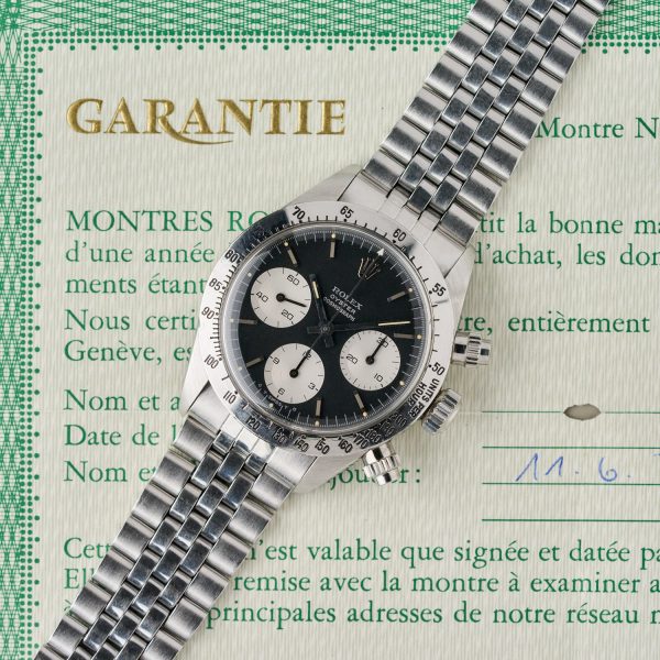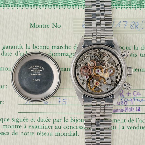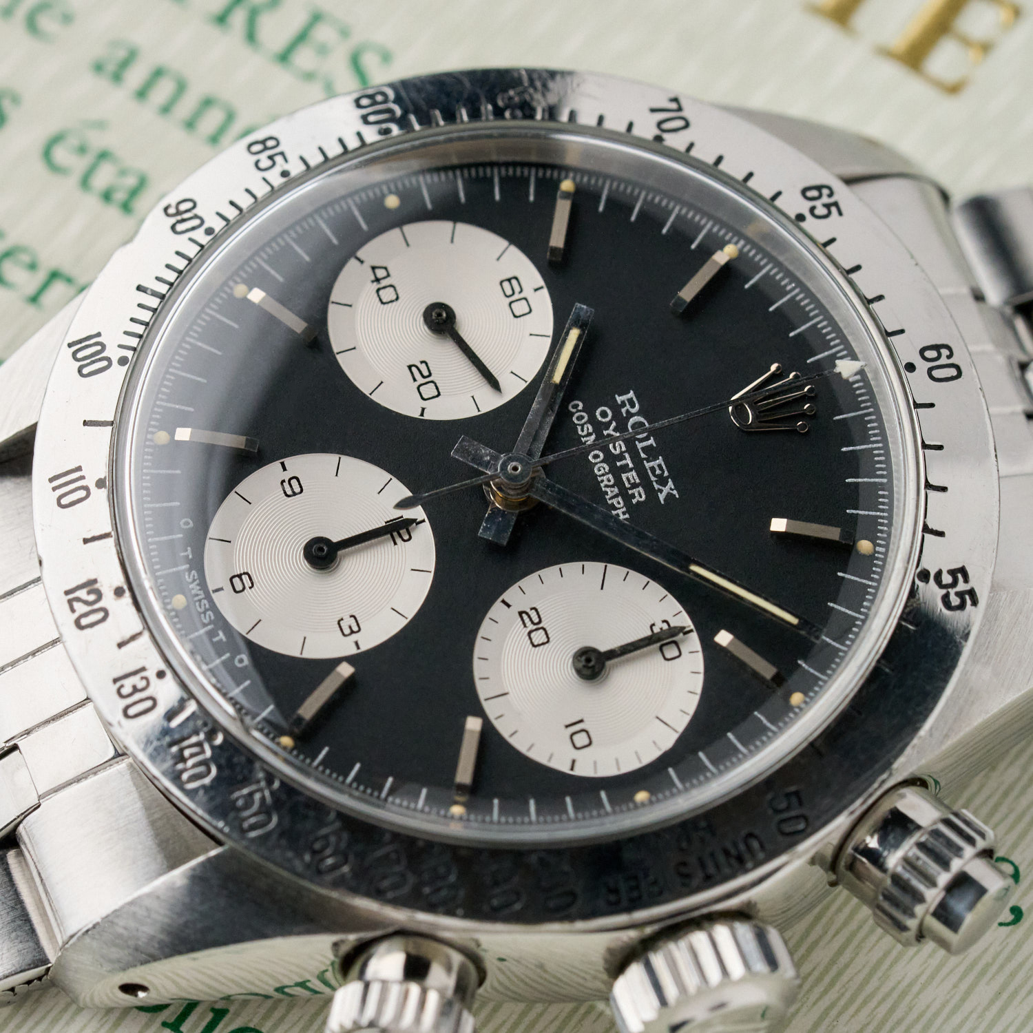 The bezel of the Rolex 6265 was made of metal with an engraved tachymeter scale, unlike that of the Rolex 6263, which was printed in white on a black bakelite background.