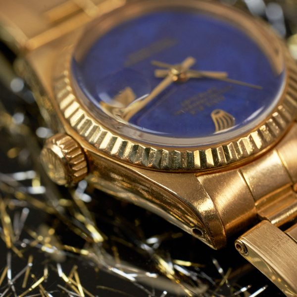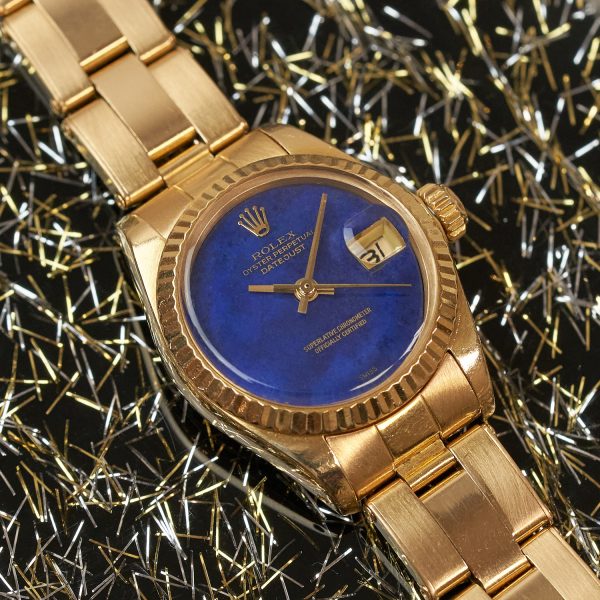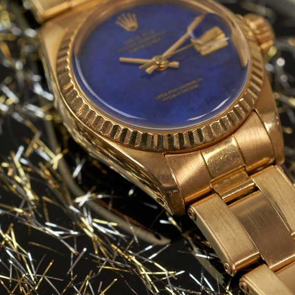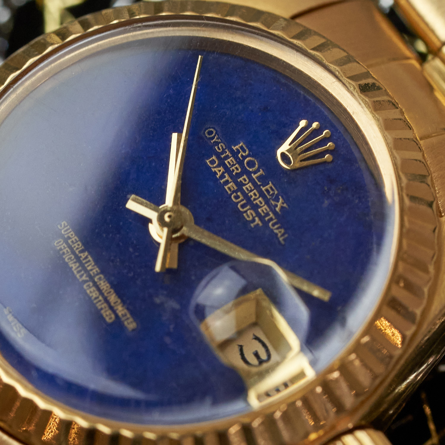 ROLEX DATEJUST REFERENCE 6917 LAPIS DIAL WITH 18K GOLD WITH RIVETED OYSTER BRACELET.