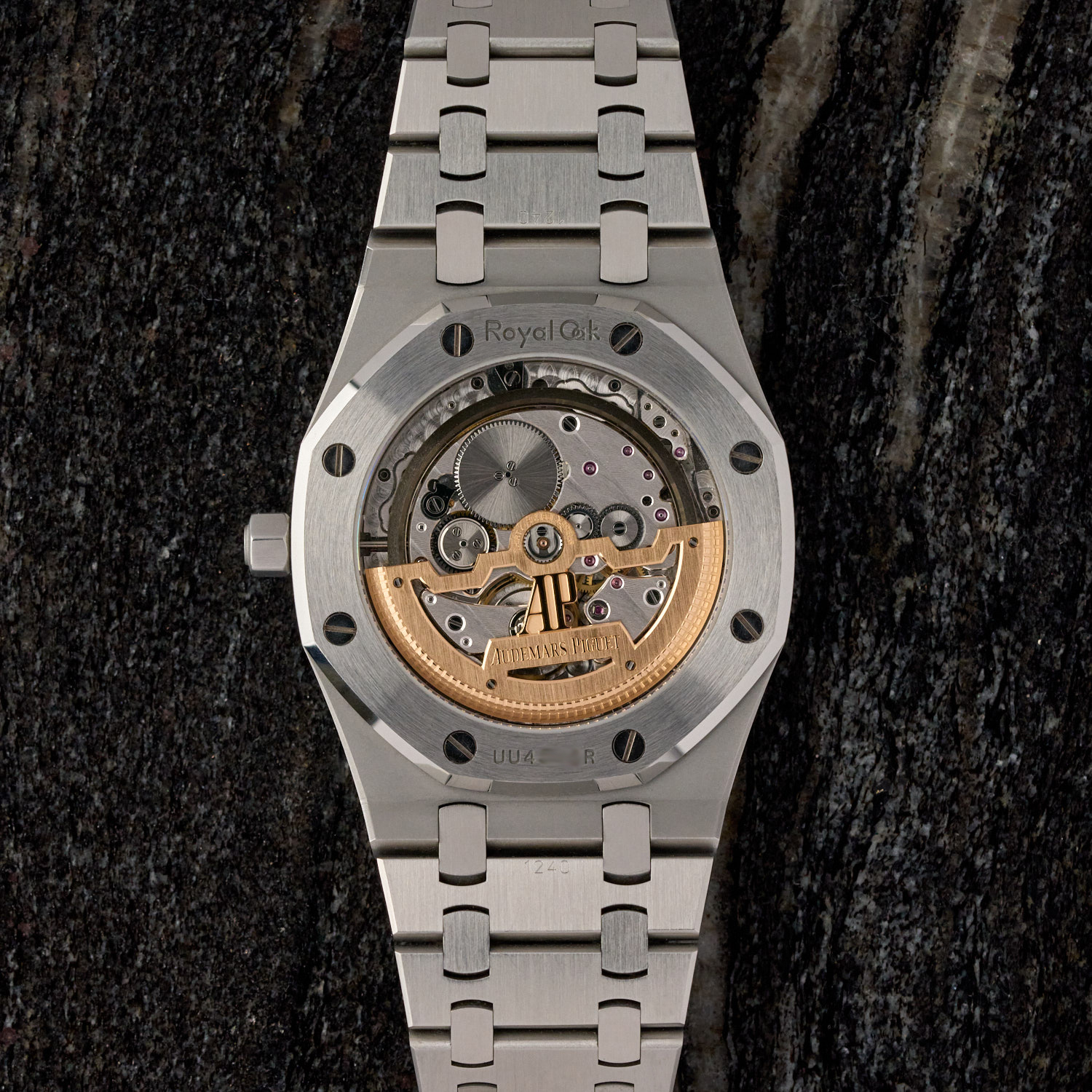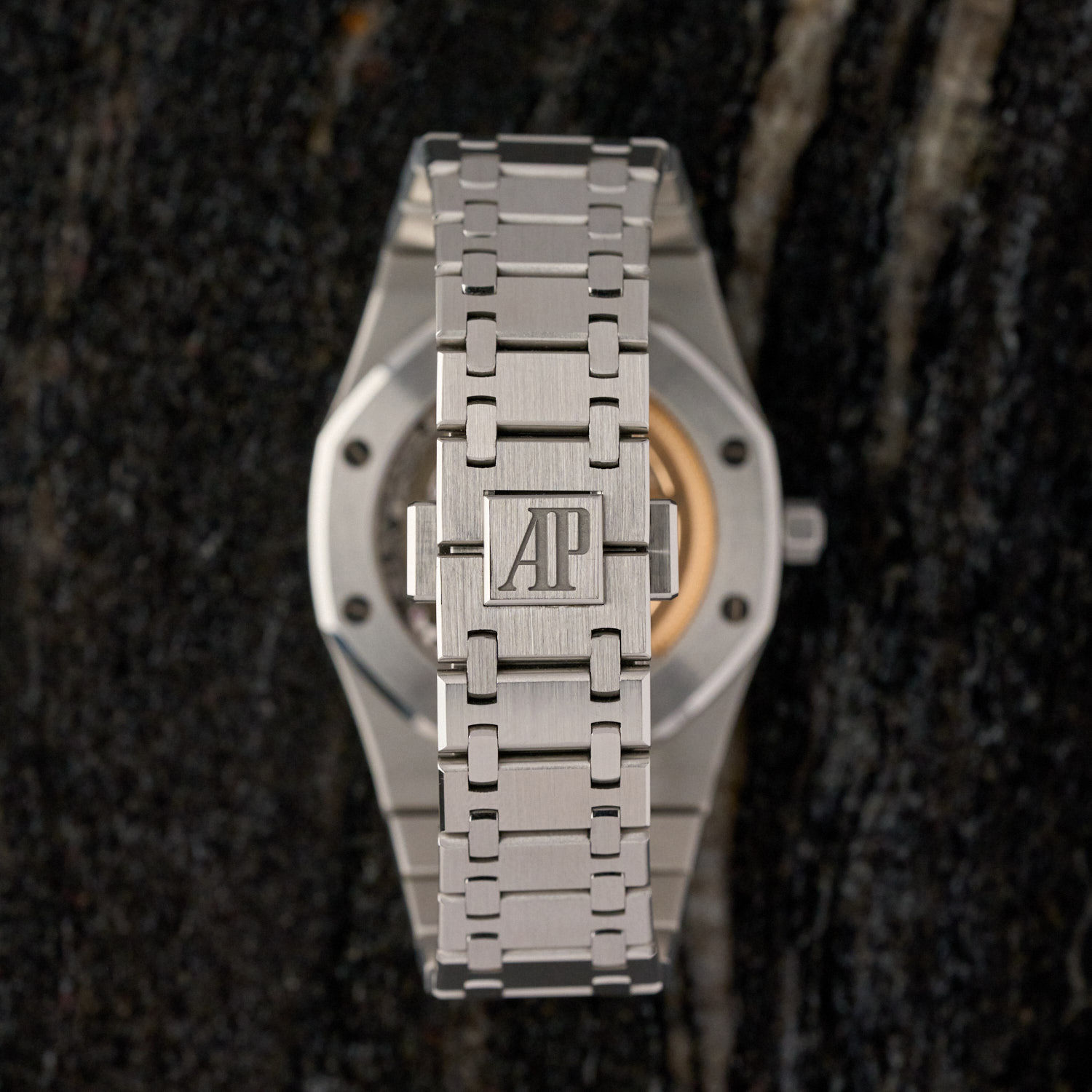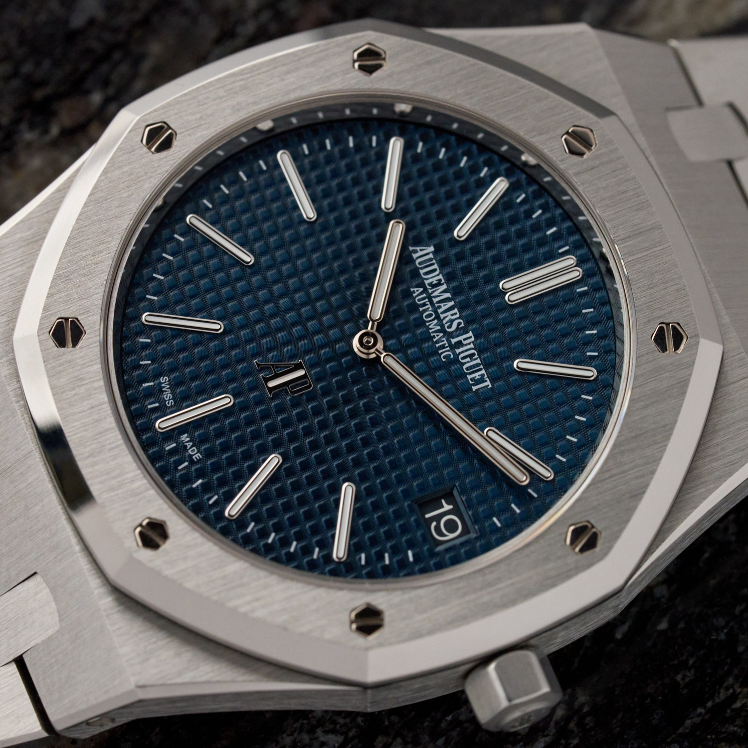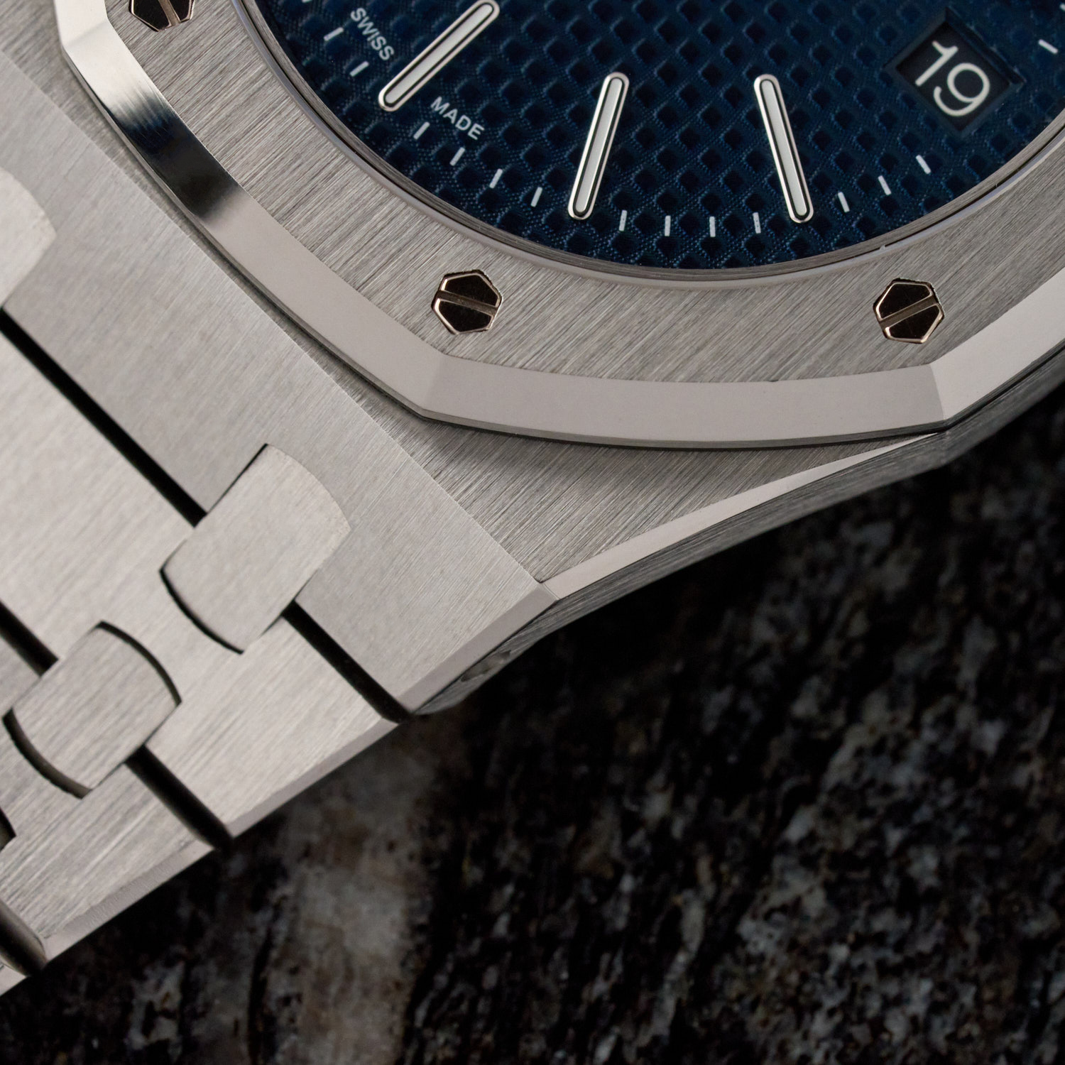 Audemars Piguet Royal Oak è considerato il mito degli orologi sportivi di lusso. Tutto ebbe inizio nei primi anni ’70 grazie al rivoluzionario Gerald Genta, sviluppando una cassa monoblocco con lunetta ottagonale installata e saldata da otto viti esagonali con l’iconico quadrante Tapisserie ed il suo colore grigio scuro. Presenta inoltre la peculiarità del logo “AP” ad ore “6”. La referenza 15202ST, Jumbo Extra Piatto, è l’erede della mitica referenza 5402ST Jumbo, la prima creazione in casa Audemars Piguet di Gérald Genta, il designer più influente della storia dell’orologeria.