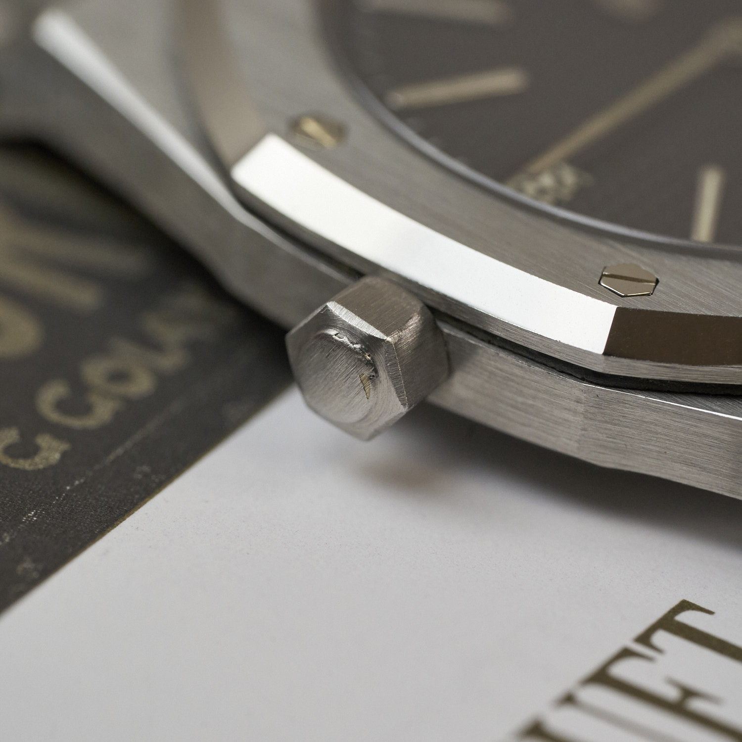 Audemars Piguet Royal Oak è considerato il mito degli orologi sportivi di lusso. Tutto ebbe inizio nei primi anni ’70 grazie al rivoluzionario Gerald Genta, sviluppando una cassa monoblocco con lunetta ottagonale installata e saldata da otto viti esagonali con l’iconico quadrante Tapisserie ed il suo colore grigio scuro. Presenta inoltre la peculiarità del logo “AP” ad ore “6”.