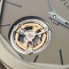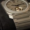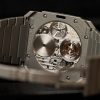 La cassa è alta 5,15 mm ma il suo design ottagonale spalma letteralmente sul polso i 40 mm di diametro. Ad ore sei troviamo la complicazione Tourbillon che visto lo spessore della cassa dell’orologio risulta essere un operazione di altissima capacità e precisione ingenieristica.
