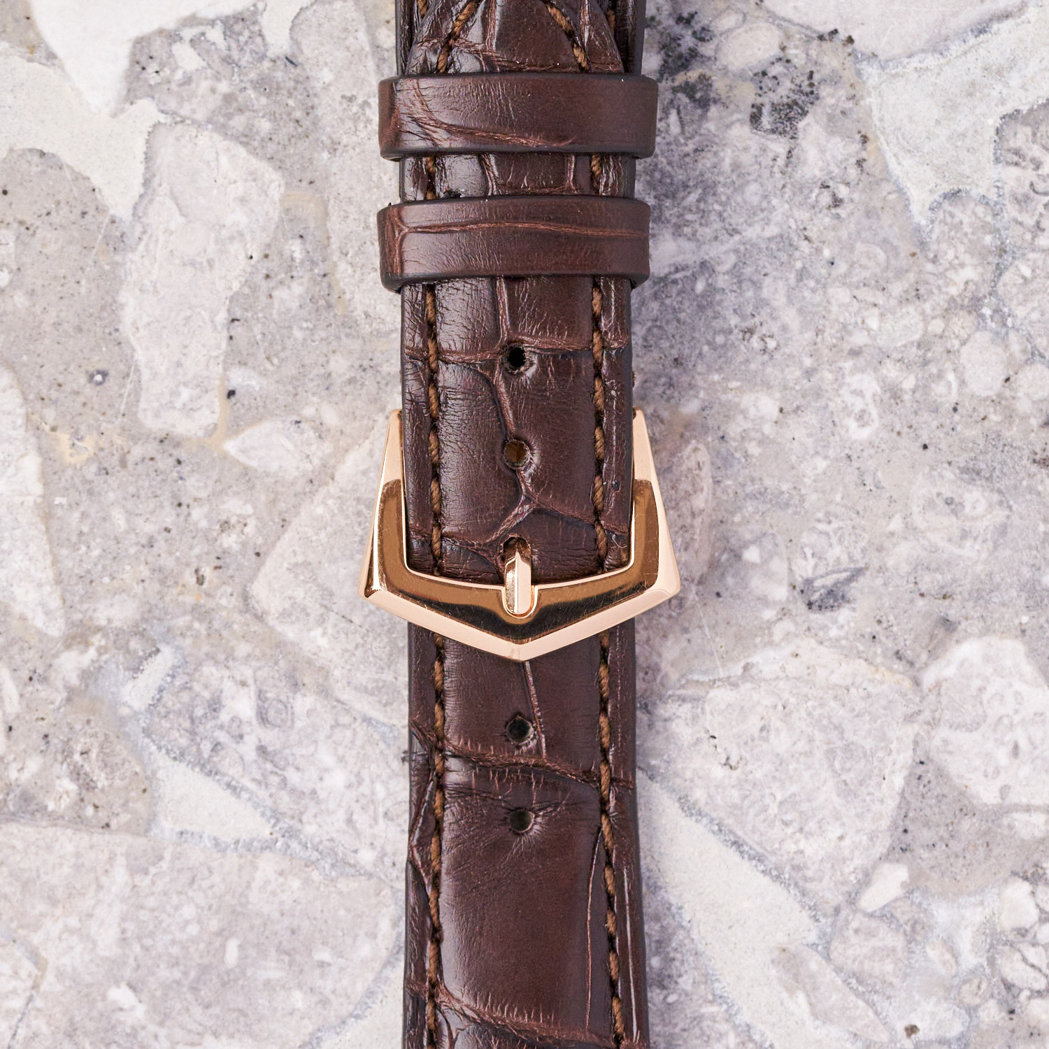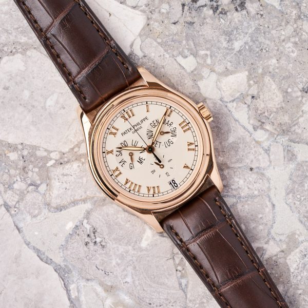 Patek Philippe ha introdotto per la prima volta la complicazione del calendario annuale nel 1996, una complicazione rivoluzionaria per l’azienda che era più funzionale degli orologi con triplo calendario standard, ma più accessibile e meno costosa della complicazione del calendario perpetuo. Le anse del presente orologio sono uno dei dettagli più interessanti che conferiscono anche un peso più leggero a questo masterpiece in oro bianco.