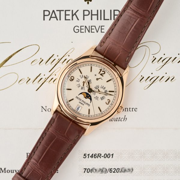 L’attuale Patek Philippe referenza 5146R con complicazione calendario annuale presenta le seguenti caratteristiche: