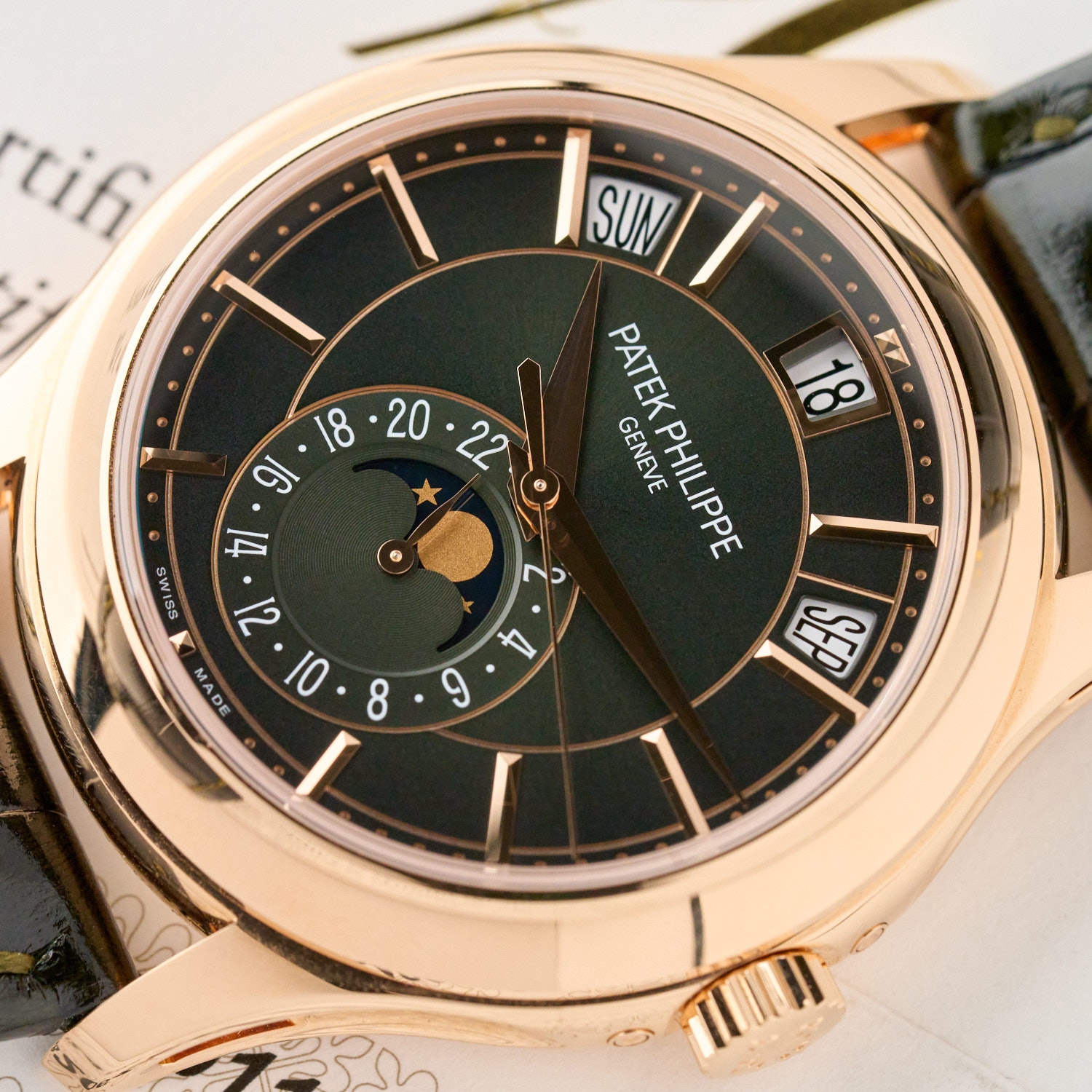 Patek Philippe Annual Calendar 5205R – 18K Rose Gold – Olive Green Sunburst Dial – Like New – Full Set