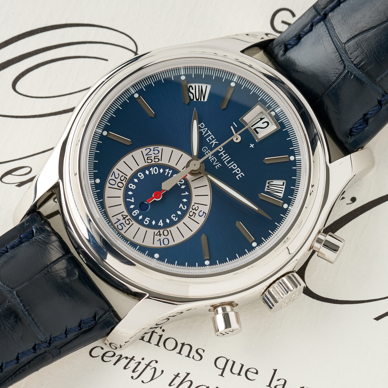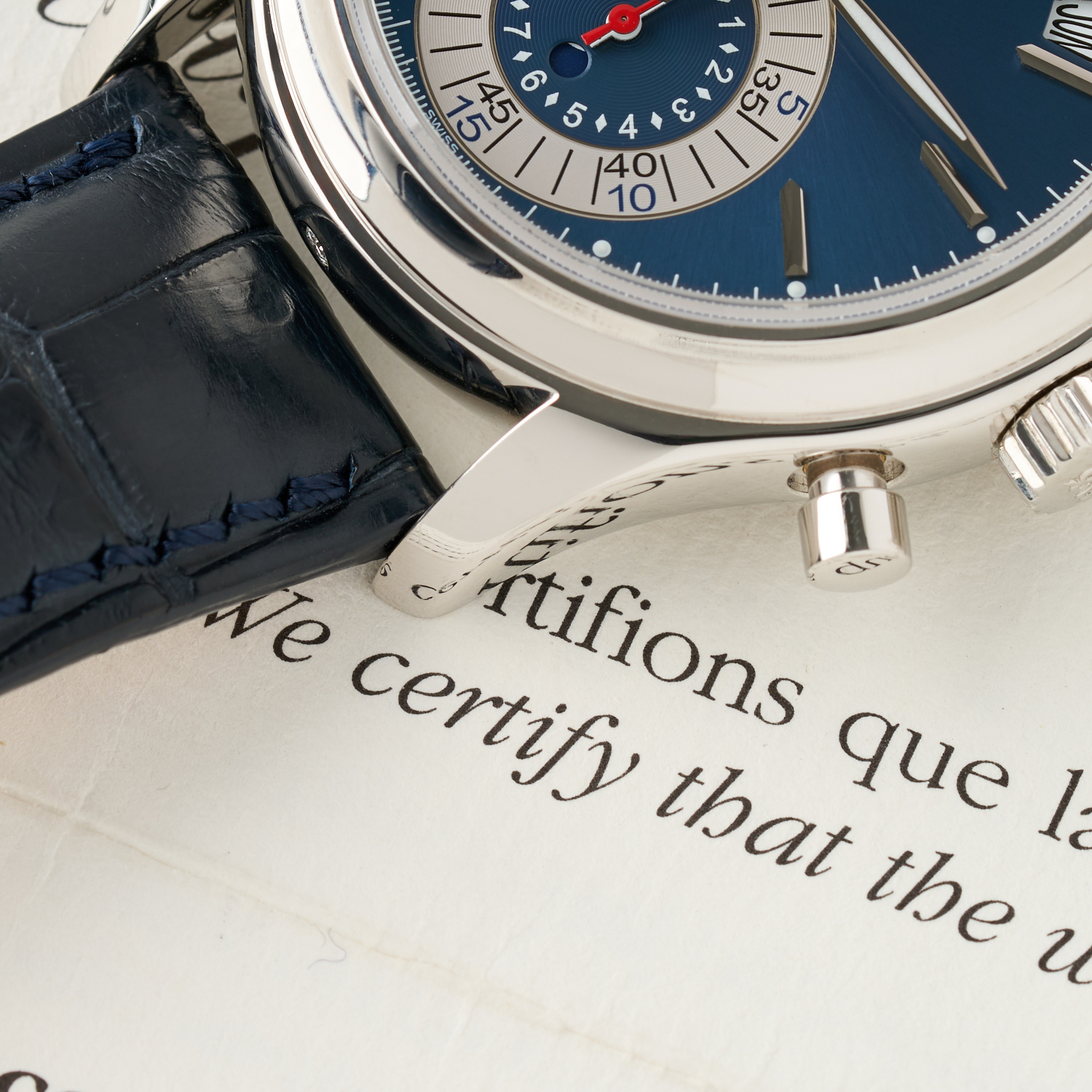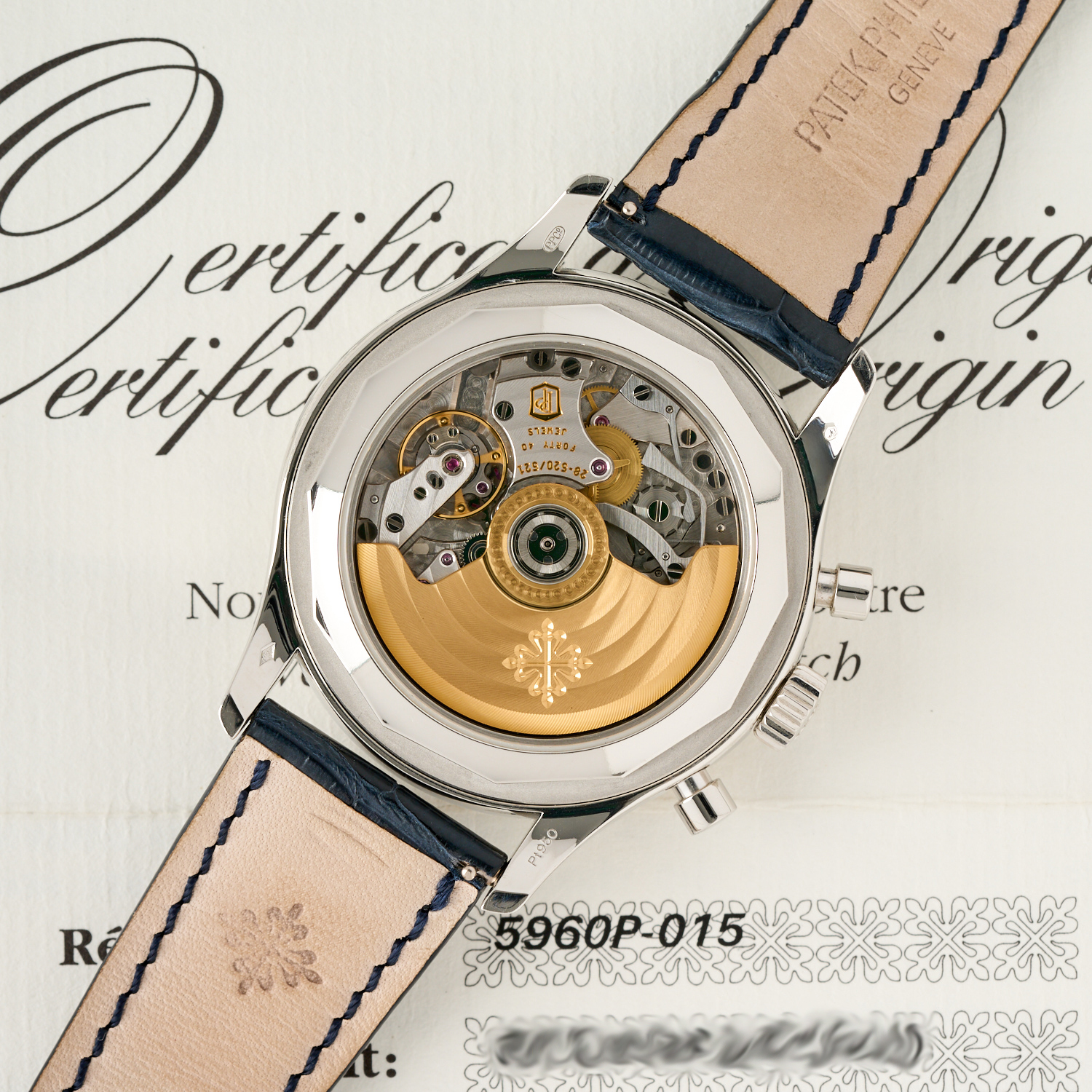 Il Patek Philippe Annual Calendar Chronograph ref. 5960 fu presentato per la prima volta nel 2006 ottenendo fin da subito grandi consensi. È stato il primo cronografo a carica automatica della Maison manifestando uno stile nuovo e unico rendendo la complicazione del cronografo e del calendario annuale sempre più attuale e contemporanea. Con l’uscita della referenza in acciaio inossidabile 5960 / 1A nel 2014, la configurazione in platino è diventata ufficialmente “discontinued”.