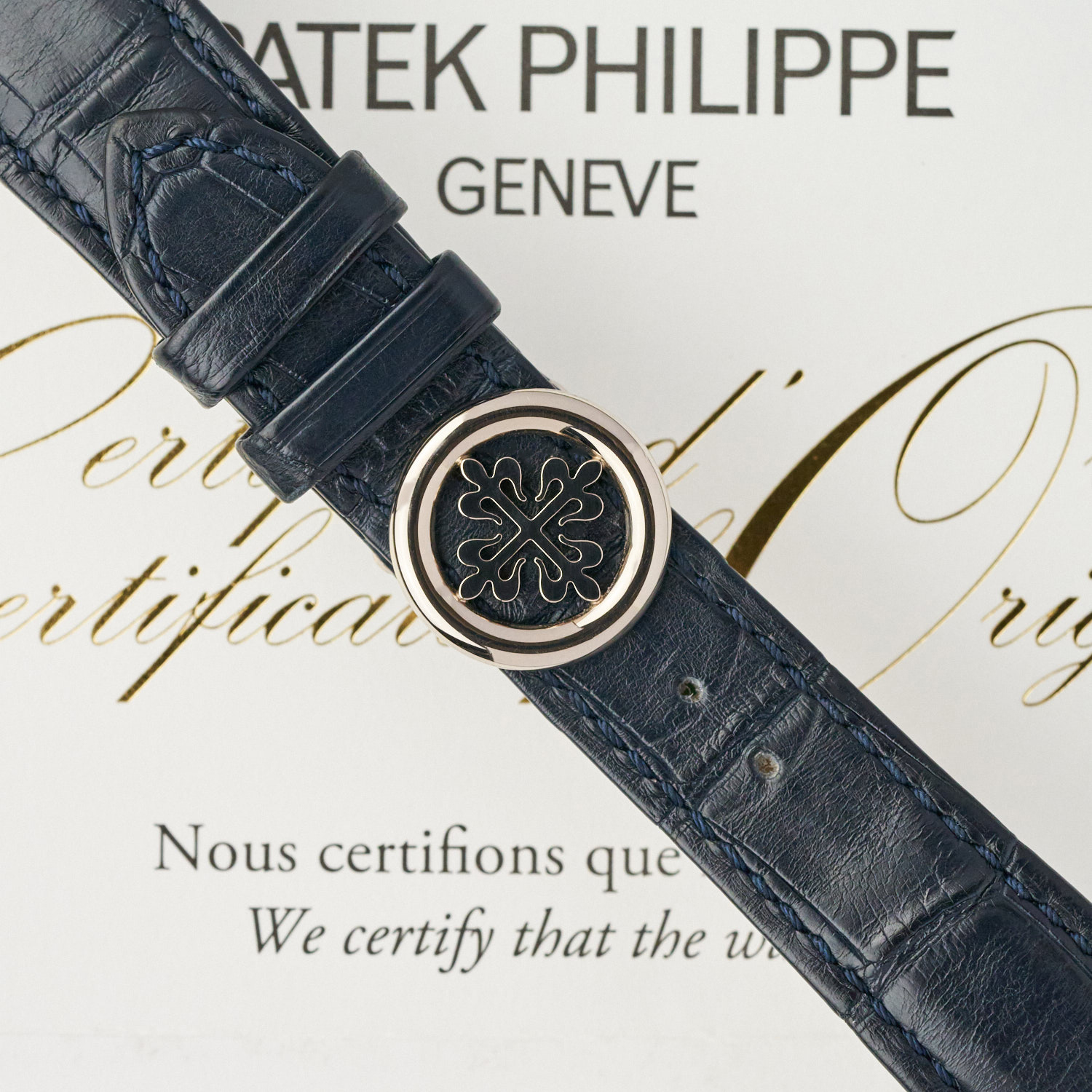 STRAP/BRACELET MATERIAL: Blue Alligator Strap with 18k white gold deployment clasp