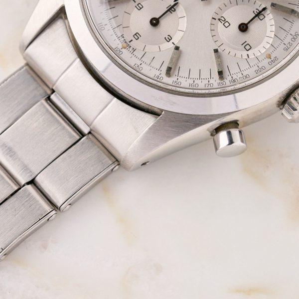 E’ l’ultimo cronografo di casa Rolex ad avere la lunetta liscia e la scala tachimetrica sul quadrante, una soluzione abbandonata nei modelli che gli succederanno, esportando la scala tachimetrica sulla lunetta.