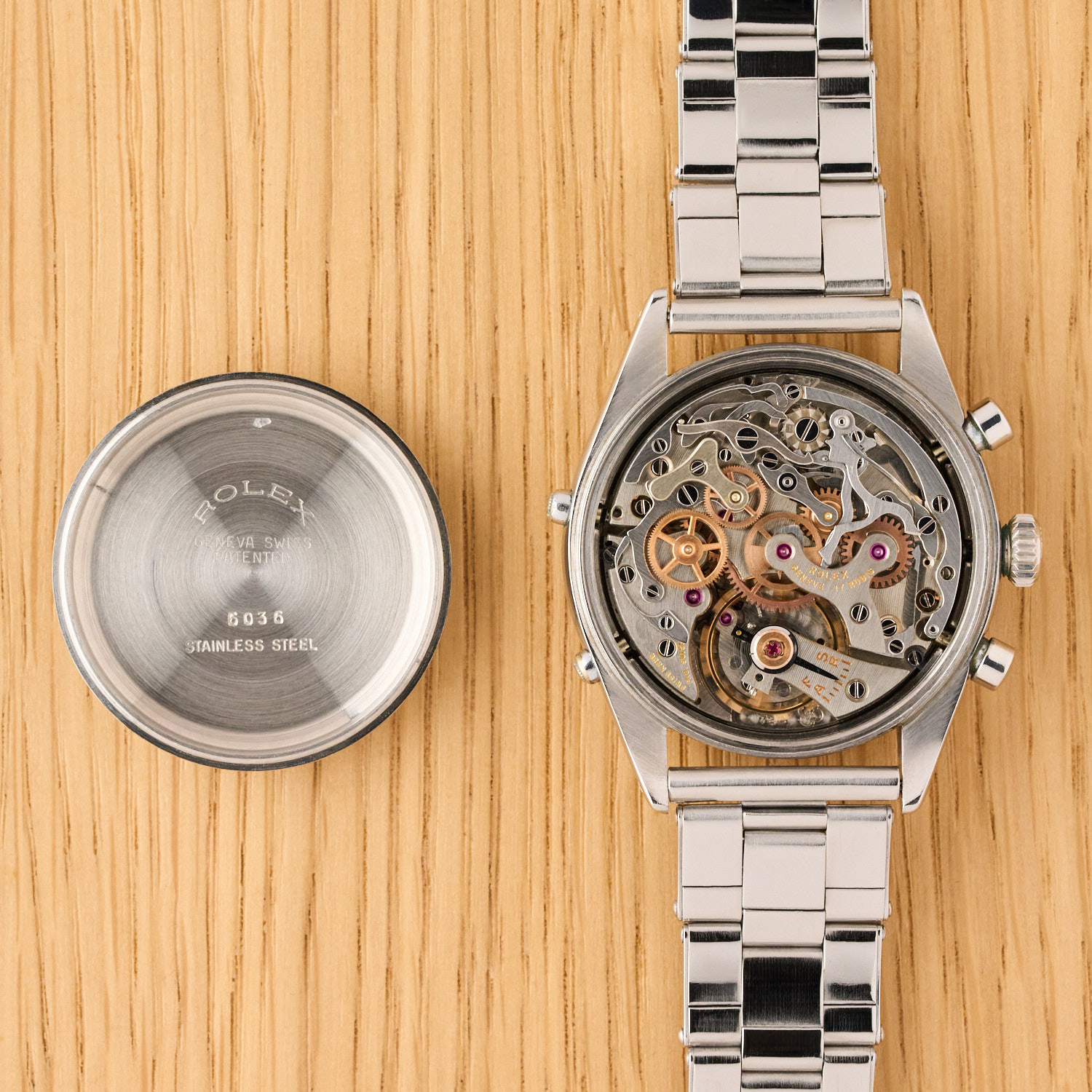 La referenza 6036, terza evoluzione della serie Dato-Compax di Rolex, incarna l’apice dell’integrazione tra complicazioni calendariali e architettura cronografica, grazie al calibro Valjoux 72C rifinito in-house.