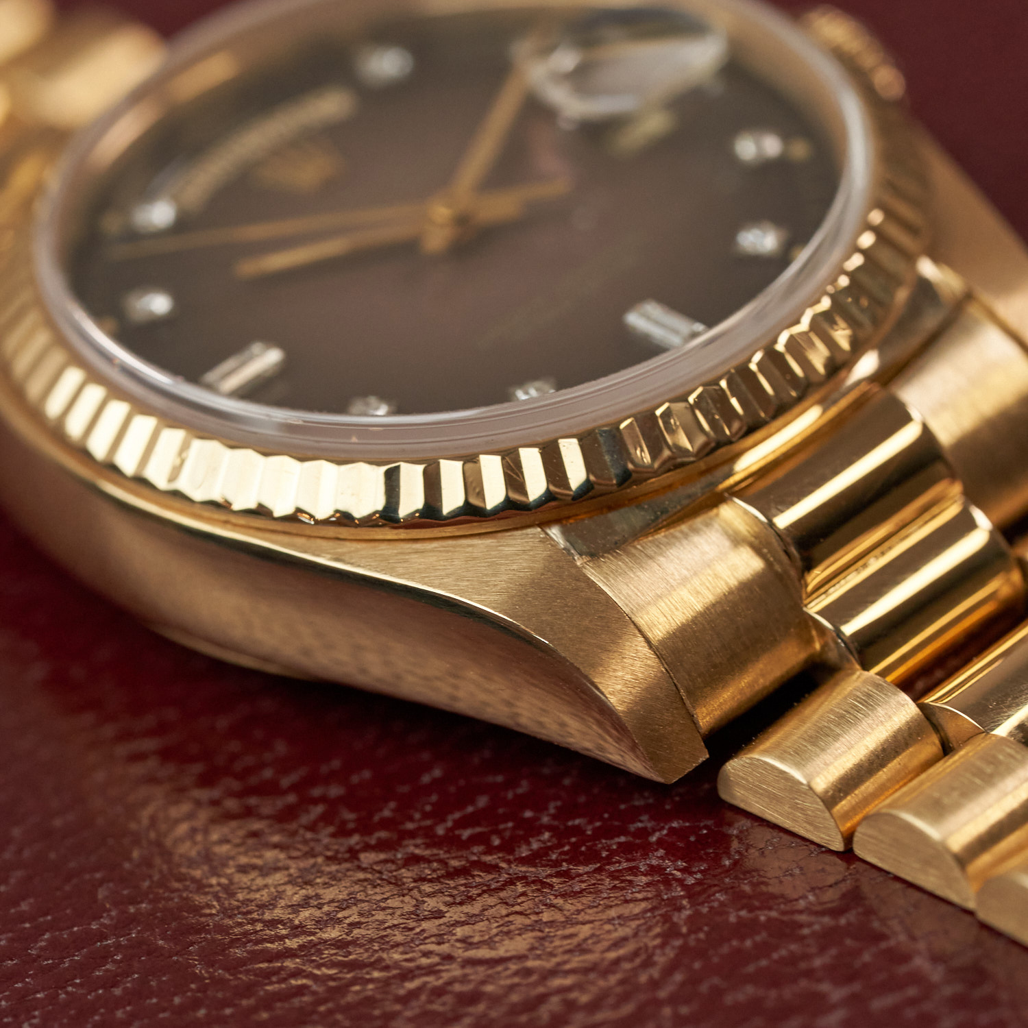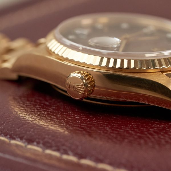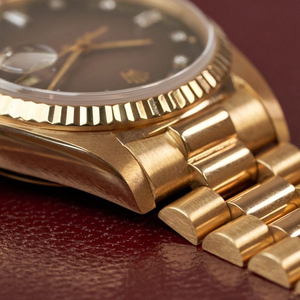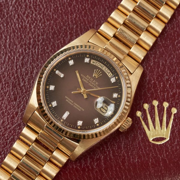 Questo orologio Vintage di lusso Rolex Day-Date referenza 18038 con quadrante dégradé marrone ed indici diamanti è disponibile presso la nostra Boutique DEANGELIS di Milano.