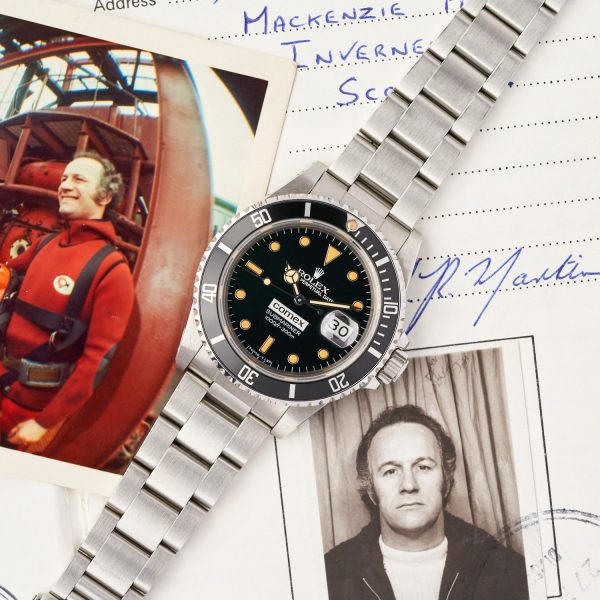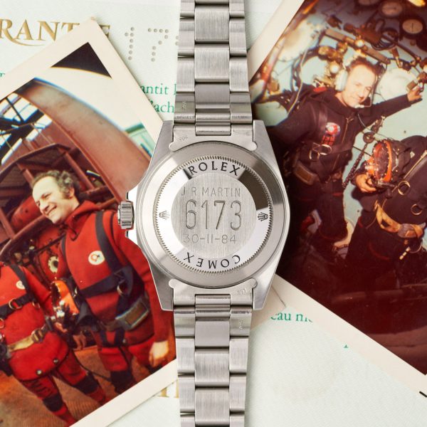 L’attuale COMEX Submariner apparteneva a John R. Martin, un sommozzatore emerito ha lavorato nei primi anni ’80 sulla piattaforma “Uncle John”, dispositivo unico realizzato per la ricerca di petrolio nel Mare del Nord, progettato per galleggiare fino alla sua posizione e, una volta cessata la produzione di petrolio, per tornare disponibile in altre parti del mondo. Presentato come un riconoscimento per i servizi del signor John R. Martin nel corso della sua carriera, questo Submariner presenta un fondello inciso con la data in cui gli è stato donato – il 30 novembre 1984 – “J. R. Martin” nella parte inferiore e il numero di assegnazione emissione 6173.