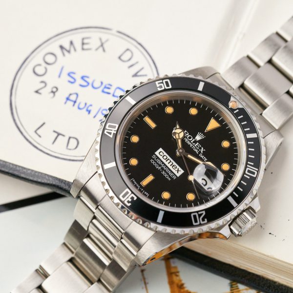 Rolex Submariner Date 16800 COMEX – Black Bicchierini Dial – Stunning Patina – NOS – Full Set